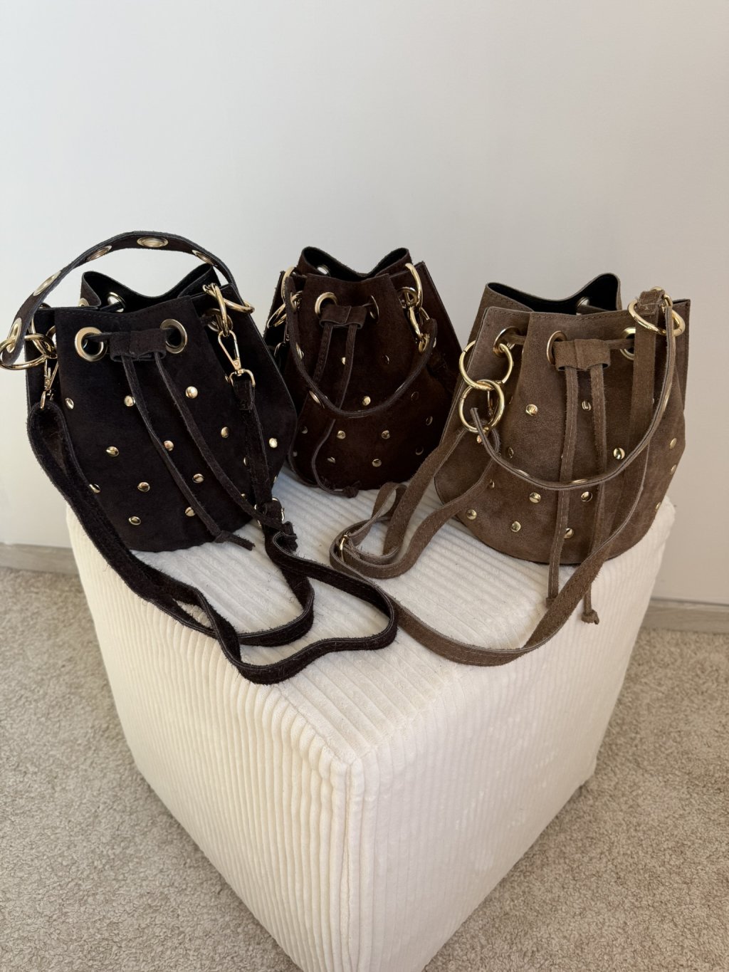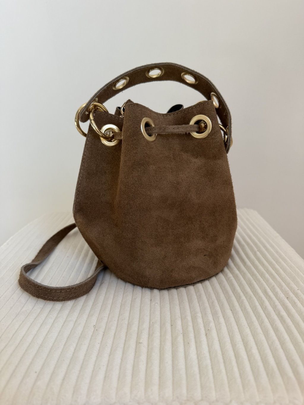 Kabelka je vyrobená z brúsenej kože. Na jednej strane má zlaté aplikácie, uzatváranie kabelky je formou sťahujúcej šnúrky. Kabelka má pútko do ruky a rovnako aj crossbody nastaviteľné odnímateľné pútko. Dostupná vo viacerých farebných prevedeniach.