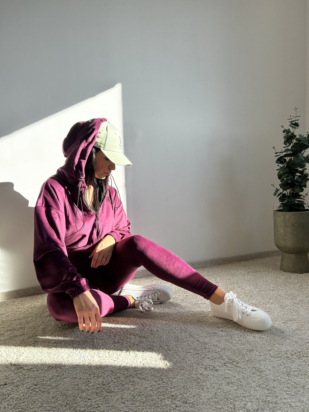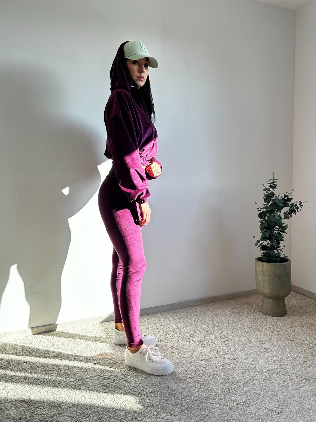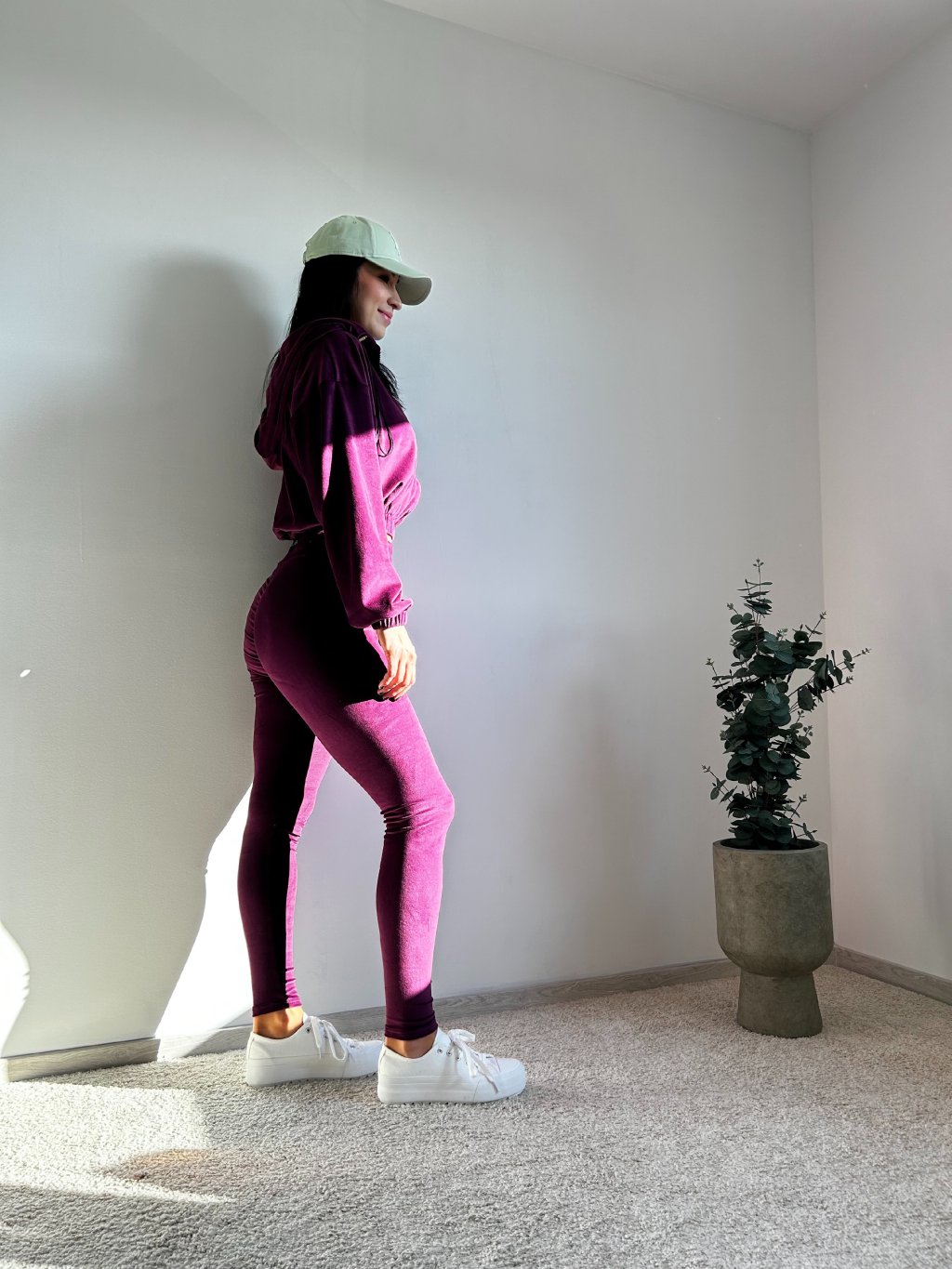 Komplet zložený z mikiny a legín, vyrobený z na dotyk pripomínajúci zamatový materiál. MIkina je krátkeho oversize strihu, so zapínaním na zips, kapucňa má v zadnej časti nášivku s nápisom BESQUAR. Legíny majú na páse v zadnej časti nášivku s logom a zadný šev je ozdobne zošitý.