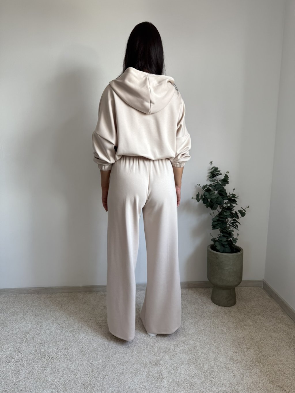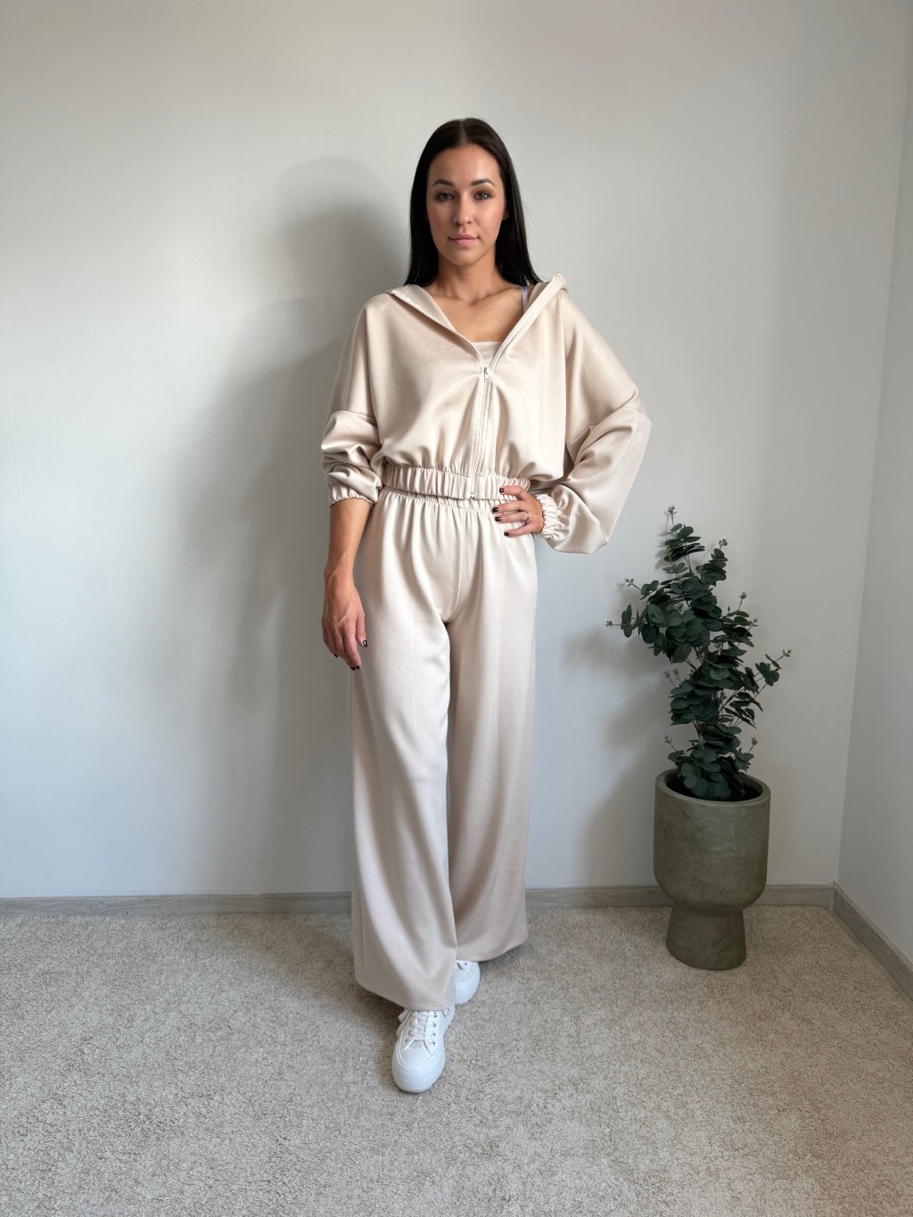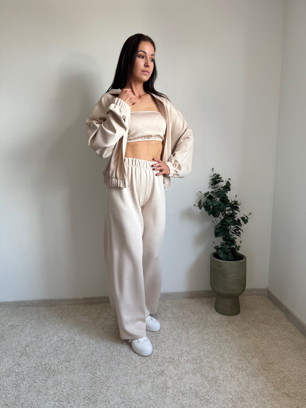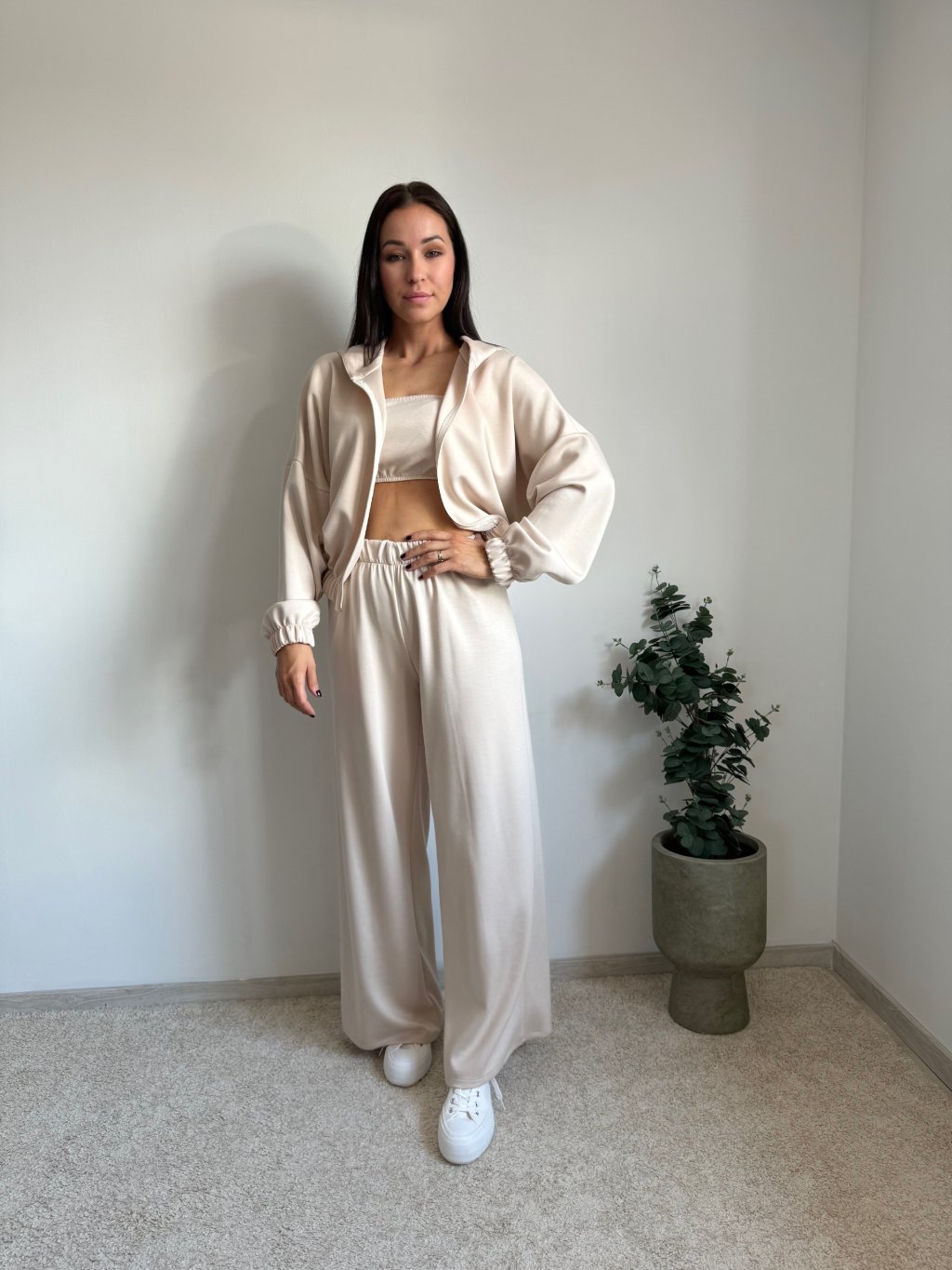Komplet zložený z braletu, mikiny s kapucňou na zips a nohavíc širokého rovného strihu, v páse na gumu. Dostupný v dvoch farebných variantoch, UNI veľkosť sediaca na XS-L.