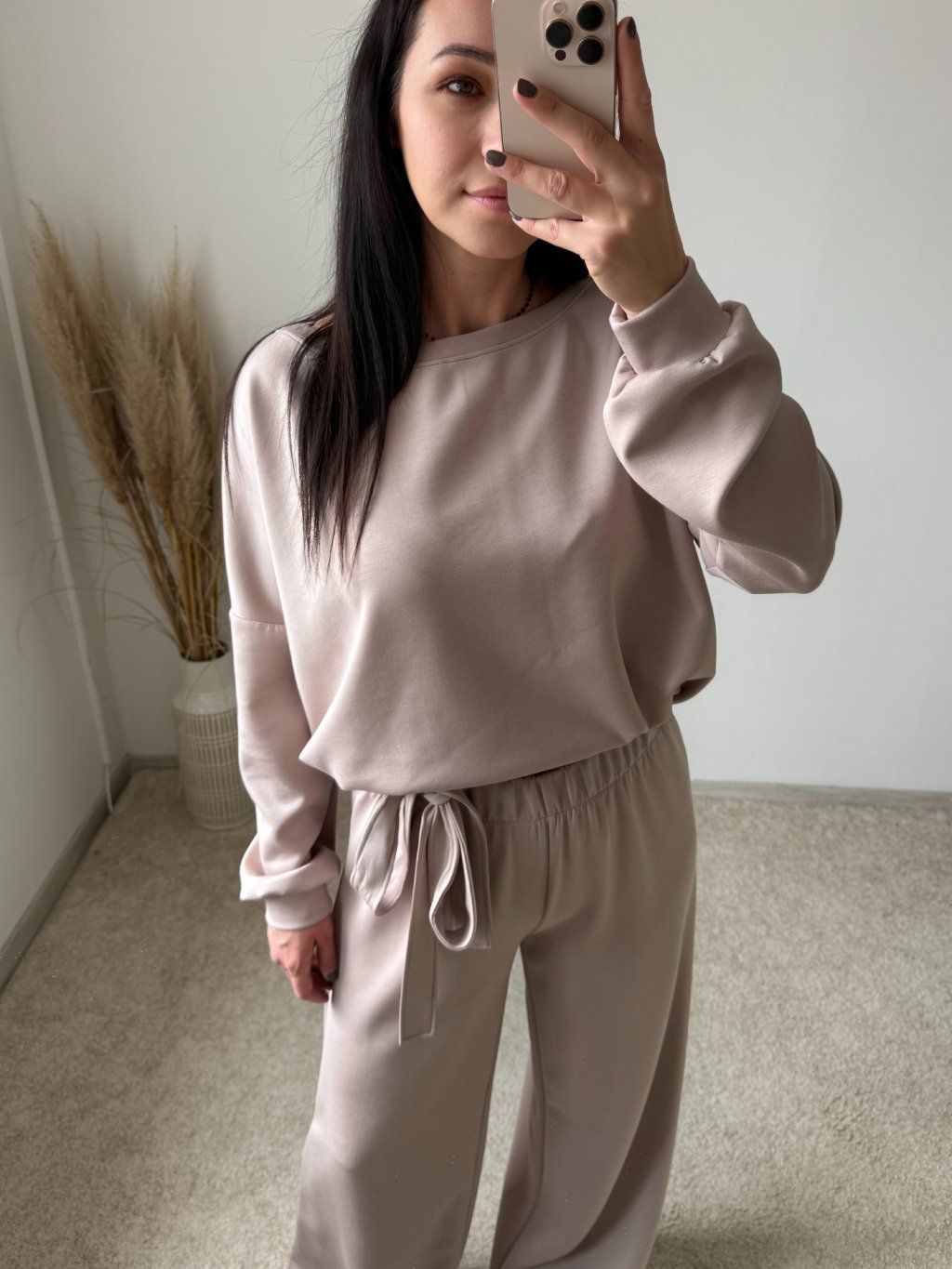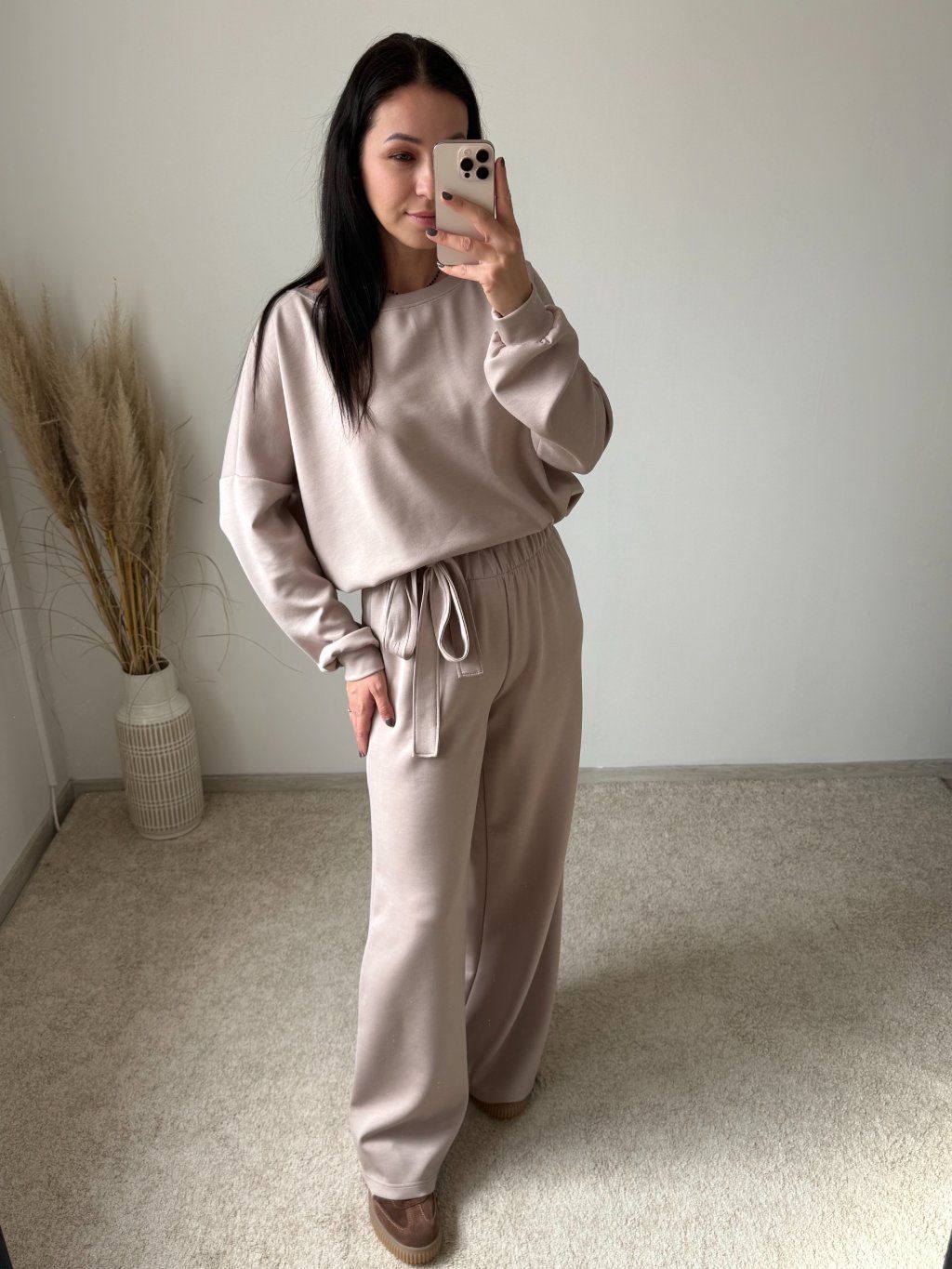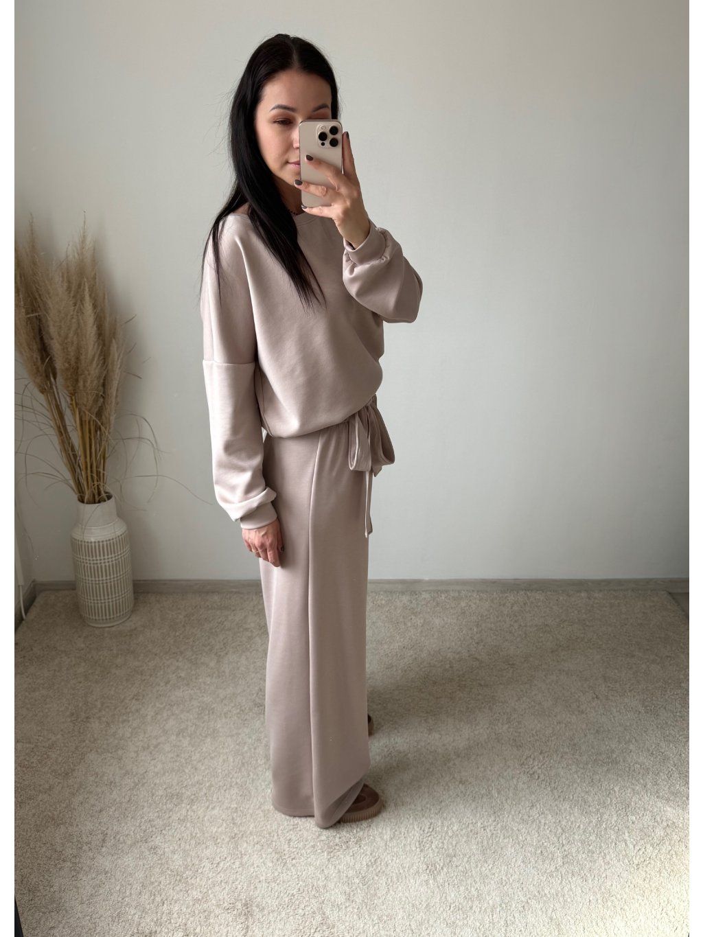 Komplet je oversized strihu a pozostáva z vrchného topu s dlhým rukávom, ukončený patentom na rukávoch a spodnej časti topu a ozdobnou látkou uväzujúcou sa na mašľu a nohavíc, ktoré sú širokého a rovného strihu, v páse na gumu. Komplet je dostupný v dvoch farebných variantoch a UNI veľkosti sediacej na S-XL.