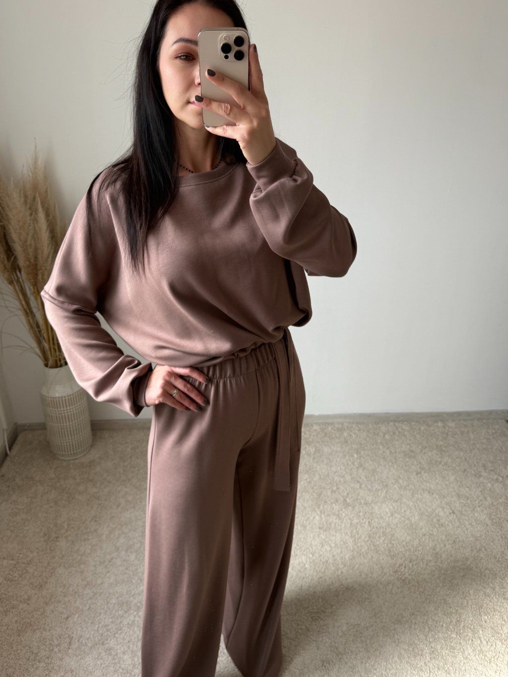 Komplet je oversized strihu a pozostáva z vrchného topu s dlhým rukávom, ukončený patentom na rukávoch a spodnej časti topu a ozdobnou látkou uväzujúcou sa na mašľu a nohavíc, ktoré sú širokého a rovného strihu, v páse na gumu. Komplet je dostupný v dvoch farebných variantoch a UNI veľkosti sediacej na S-XL.