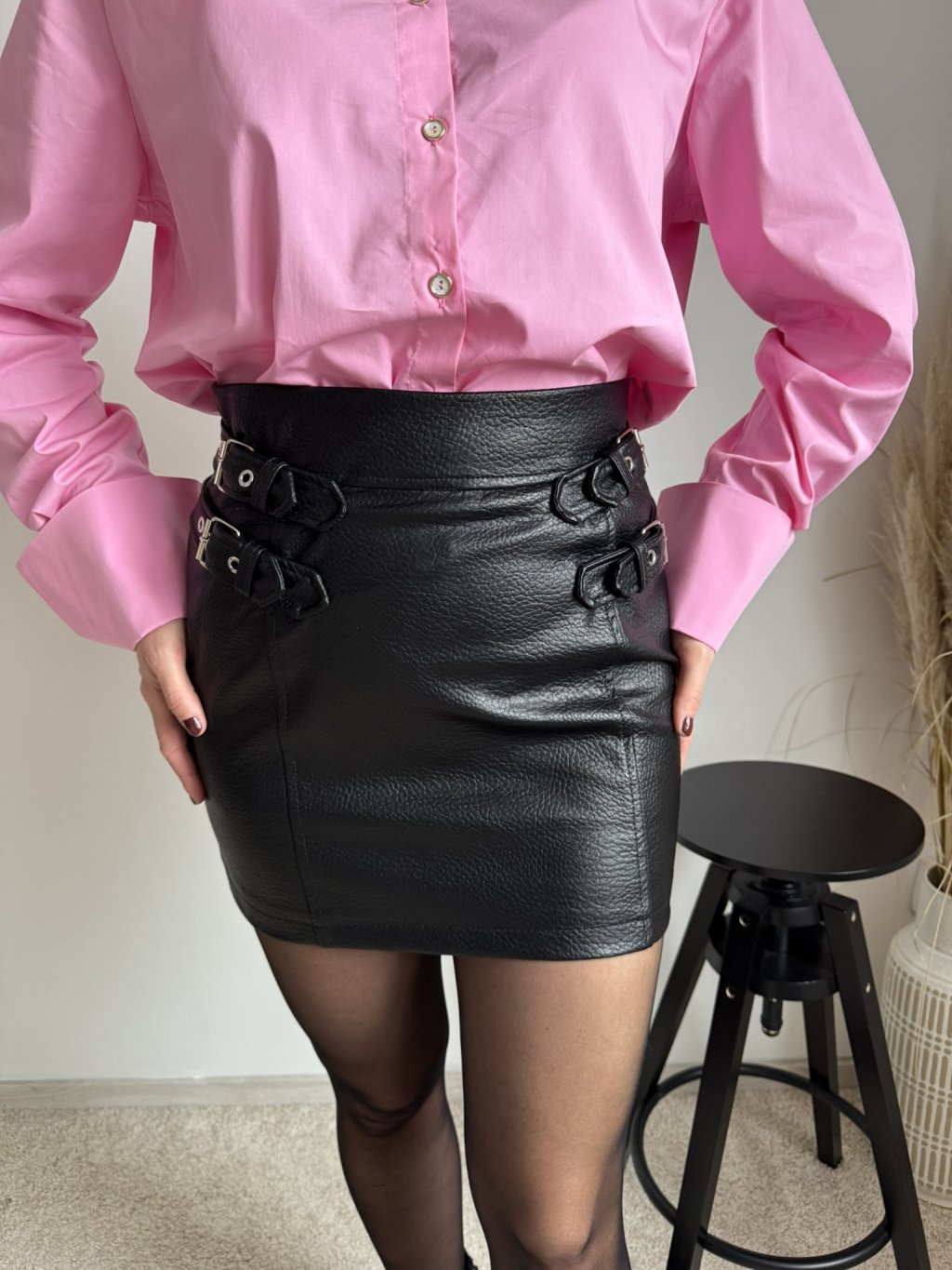 Koženková sukňa je s vysokým pásom a skrytým zipsom vzadu. Na bokoch sú ozdobné pracky. Sukňa je vyrobená zo štrukturovanej ekokože v mini dĺžke.