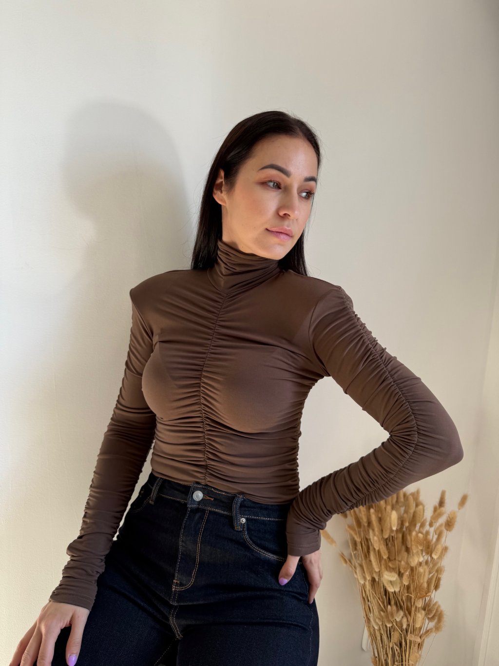 Rolák je zaujímavého strihu, na prednej a zadnej strane a rukáve je ozdobne stiahnutý gumičkou z vnútornej strany. Na pleciach má vypchávky a je dostupný v troch veľkostiach.