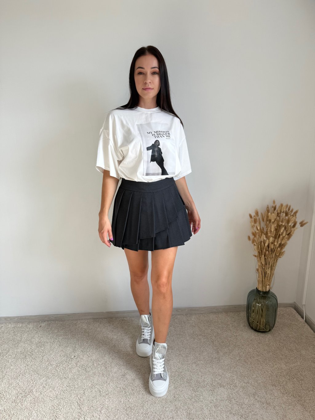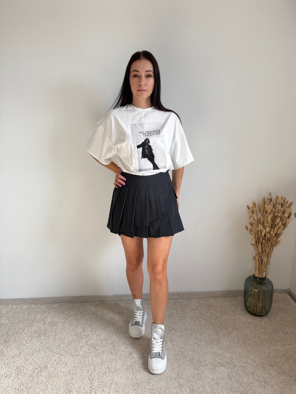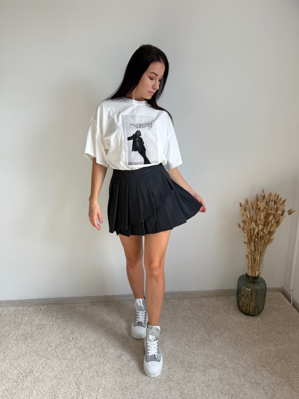 Sukňa má všité šortky, na boku zips a je vyrobená z nekrčivého materiálu. Má áčkový strih a je dostupná v dvoch farebných variantoch.