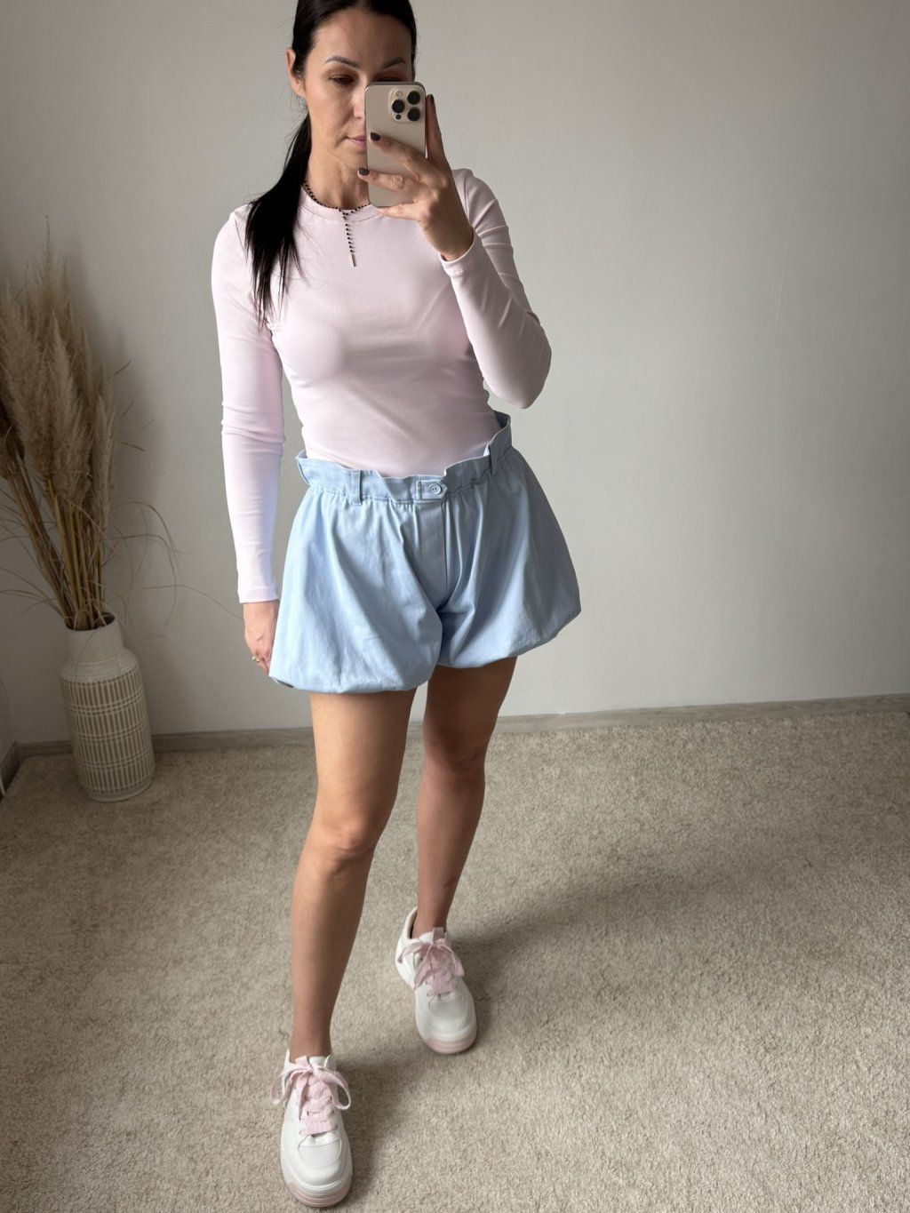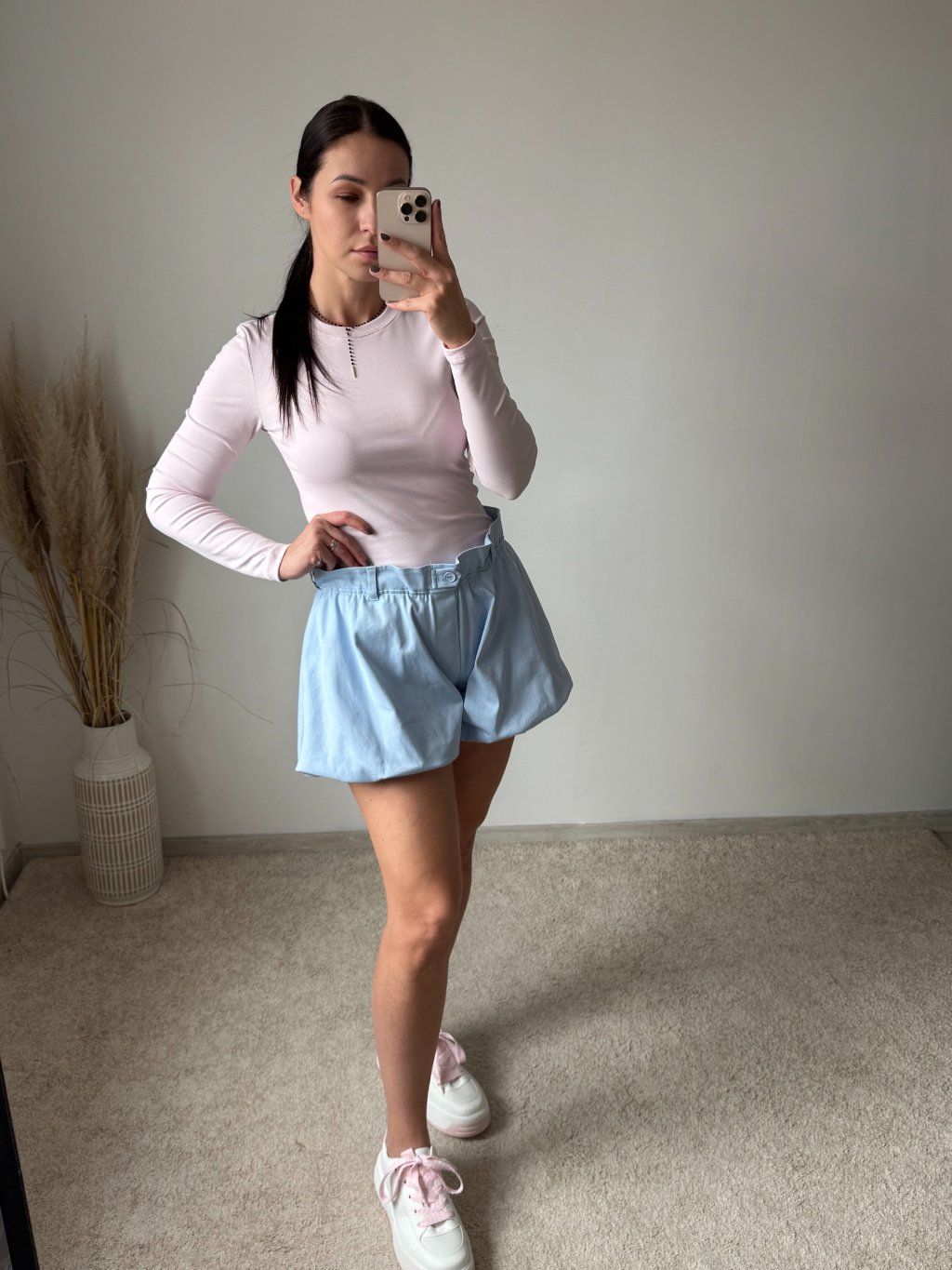 Šortky sú balónového strihu, na zips a gombík, s ozdobným nariaseným lemovaním v hornej časti. Na bokoch majú vrecká, sú podšité a dostupné v dvoch veľkostiach.