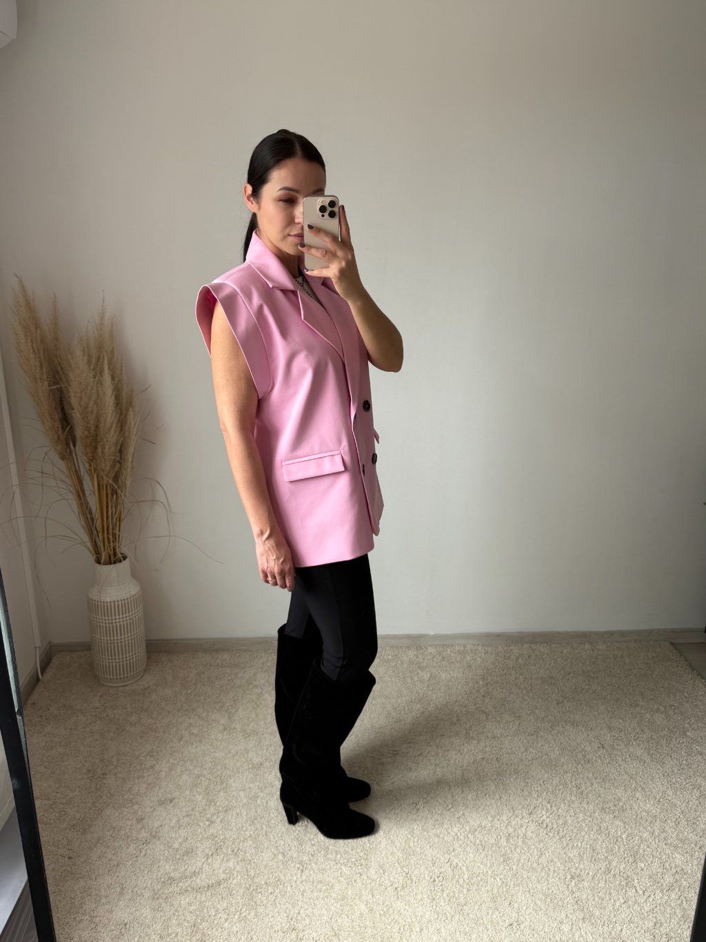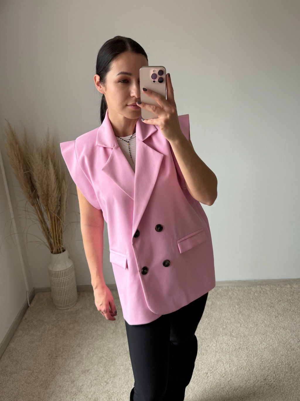 Vesta je oversized strihu, s výrazným strihom látky na pleciach, s vypchávkami, so zapínaním na gombíky a s klopňami na vreckách. Dostupná v predĺženej dĺžke a UNI veľkosti sediacej na S-L.